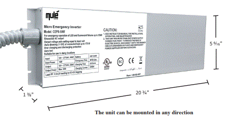 50W EMERGENCY MICRO INVERTER FOR LED & FLUORESCENT LIGHTING 120V-277V-IN 1-PHASE 2-WIRE 120V/277V-OUT 1-PHASE 2-WIRE + GROUND 90MIN RUN TIME 1 FLEX CONDUIT UL LISTED T20/COMPLIANT L 20.75" W 5.38" H 1.38" 9.75LBS MULE