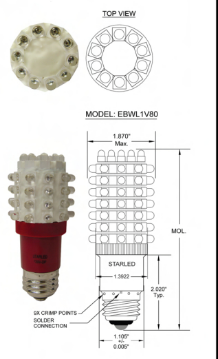 LED WARNING LIGHT T8 E26-MEDIUM SCREW WHITE 250V 4.01"L X 1.87"D