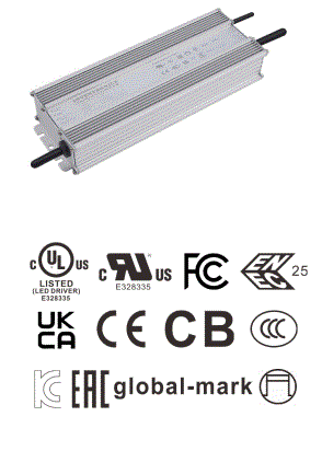 480W PROGRAMMABLE LED DRIVER 90V-305VAC-IN 8600mA-10000mA DEFAULT=10000mA 24V-56VDC-OUT W/INV 0-10V PWM RESISTOR 3-TIMER MODE DIMMING 12VDC AUX @ 250mA 480W MAX 100000HRS PF:>0.99@120VAC PF:>0.96@220VAC IP66 L 10.31" W 3.54" H 1.71" 4.11LBS