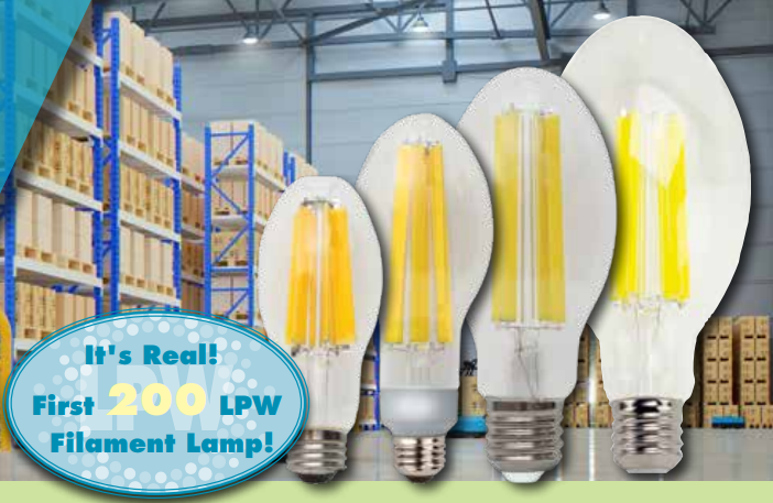 30W CLEAR FILAMENT ED28 LED E39-MOGUL SCREW BASE 120V-277V TYPE B-BALLAST BYPASS =150W HPS 2200K CRI-80 4600LM 360DEG BEAM ANGLE 50000HRS WET/OPEN/ENCLOSED RATED L 8.2" D 3.5" 0.42LBS EA