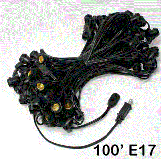 PSI15100BK 100FT BLACK HEAVY DUTY OUTDOOR LIGHT STRING W/75 ENCAPSULATED WEATHER RESISTANT E17 INTERMEDIATE SCREW BASE IN-LINE SOCKETS BRASS CONTACTS 16AWG SPT 2-WIRE 10 WATT MAX INCLUDES 6FT LEAD TO 2-PRONG MALE PLUG 12" TAIL W/PLASTIC CONNECTOR FOR HOOK |