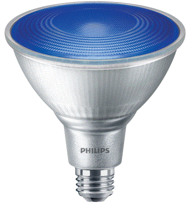 13.5PAR38/PER/BLUE/G/E26/ND/ULW 13.5W BLUE FROSTED GLASS PAR38 LED E26-MEDIUM SCREW BASE 120V NON-DIM WET/ENCLOSED LOCATION RATED 10950HRS PARTY SPOT L 5.25" D 4.82" 0.77LBS |