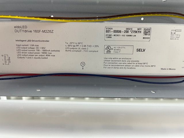 EC0361S2-ES16-400MA-LIN-10.0MIN eldoLED 50W PROGRAMMABLE LED DRIVER 100-277VAC-IN, 2-55VDC-OUT 150mA-1400mA (PROGRAMMED TO 400mA) RANGE DIMMING 0-10V 2 CONTROL CHANNELS DIM TO DARK W/SIDE LEADS, QUICK CONNECT ELDO 561S2 5.12"L X 3.01"W X 1.18"H 0.67LBS EA |