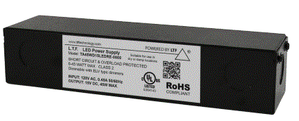 TA45WD15LEDRE 45W ELECTRONIC TRANSFORMER 120VAC-IN 5000mA/5A 15VDC-OUT LED STRIPS/BULBS INCANDESCENT HALOGEN BULBS NO MIN LOAD ELV DIMMING 0-100% IP60 ENCASED LTF L 8.10" W 2.00" H 1.70" |