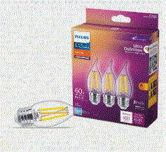 5BA11/PER/UD/CL/G/E12/WGD-6/3PF-T20 5W CLEAR GLASS B11 FILAMENT LED E12-CANDELABRA SCREW BASE 120V =60W 2200-2700K WARM GLOW CRI-95 500LM 15000HR WET LOCATION RATED T20/COMPLIANT 3-PACK L 4.38" D 1.38" |