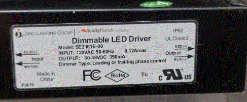 SE2160E-00 JUNO LED DRIVER 120VAC-IN 22-38VDC-OUT 225MA DIMMABLE LEADING OR TRAILING PHASE |