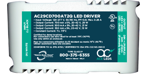 AC29CD700AT2Q 33W CC-CONSTANT CURRENT SWITCHABLE LED DRIVER 120V-277VAC/IN 29W/700mA 21W/500mA 15W/350mA 20V-42VDC/OUT 0-10V DIMMING 5 TO 100% PF:>0.9 MATCH-BOOK SIZE L 2.88" W 1.43" H 1.07" 0.15LBS |