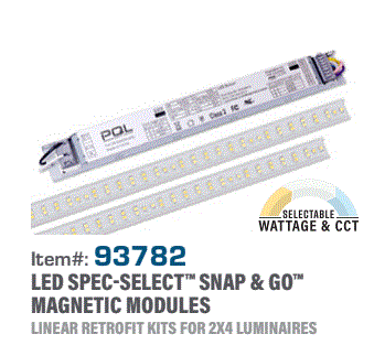 PQL-93782 2X4 SNAP & GO LED DUAL SELECT LINEAR RETROFIT MAGNETIC MODULE W/DRIVER & 2 LED STRIPS 20W/30W/40W 120V-277V 3500K/4000K/5000K CRI-83 3000LM/4500LM/6000LM 118D BEAM ANGLE B2-U1-G1 BUG RATED 0-10V DIMMING TO 10% 50000HR ENCLOSED RATED |