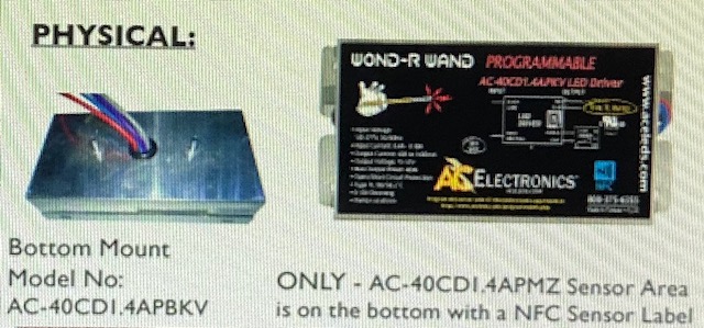 AC-25CDI.25APMV 25W 120-277V INPUT 15-55V OUTPUT LED DRIVER SENSOR AREA ON BOTTOM WITH NFC SENSOR LABEL DIMMABLE IP66 RATED VENDOR PROGRAMS 350mA TO 1250mA |