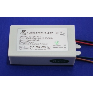 LD-VU5012-01 6W CV-CONSTANT VOLTAGE 100V-240VAC/IN 12VDC/OUT 500mA MAX CLASS 2 L 1.65" W 1.57" H 0.82" .11LBS |