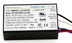 DS12W12VMB1UD 12W CV CONSTANT VOLTAGE LED DRIVER 120-277VAC-IN 12VDC-OUT 1000mA DIMMABLE TRIAC/ ELV/ 0-10V IP64 PF>0.95 2.69"L 1.56"W 0.69"H |