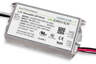 DS40W700C3057UD-F3 40W LED DRIVER CONSTANT CURRENT 100-305VAC-IN 30-57VDC-OUT 700mA DIMMABLE TRIAC/ ELV/ 0-10V DIMMING PF>0.95 2.8"L 2.5"W 1.2"H |
