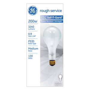 200W PS30 FROST INCANDESCENT MEDIUM BASE E26 120V-130V ROUGH SERVICE SHATTER RESISTANT TEFLON COATED 1000HRS 3240LM 8.06"MOL 3.75" DIA