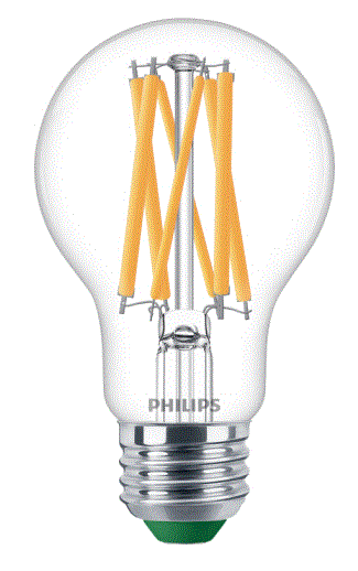 8.9W LED CLEAR GLASS A19 FILAMENT E26-MEDIUM SCREW BASE =100W 120V 2700K CRI>90 1520LM DIMMABLE 300DEG BEAM SPREAD 50000HRS WET/DAMP/DRY LOCATION RATED L 4.19" D 2.38"