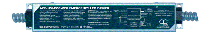 5W/OUT EMERGENCY LED DRIVER 120V-277VAC/IN 8W/IN 91mA-333mA 15V-55VDC/OUT DUAL CONDUIT W/TEST SWITCH 90MIN RUN TIME IP30 L 9.50" W 1.70" H 1.20" 1.98LBS