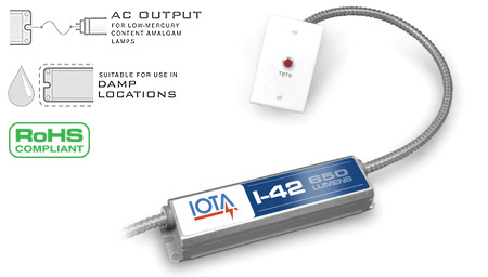 I-42-A IOTA FLUORESCENT EMERGENCY BALLAST FOR 4-PIN 1L 10W-42W OR 2L 10W-18W 650LM 90MIN OPERATING TIME DUAL FLEX I42AM5 NOT CA/COMPLIANT 9.5"L 2.4"W 1.5"H 4.00 LBS |