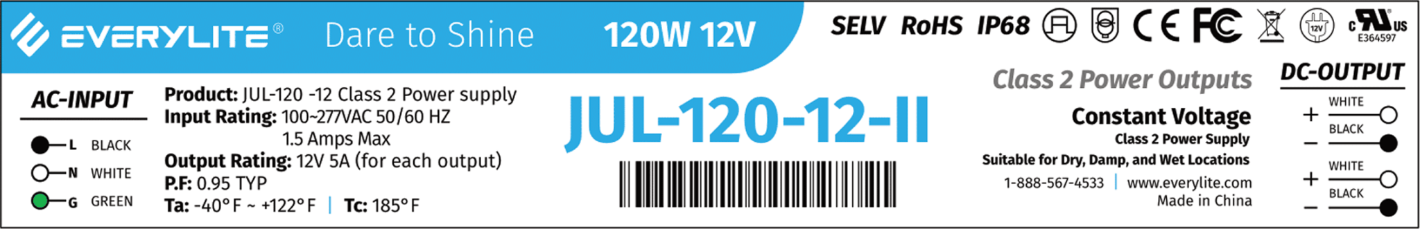 120W CV-CONSTANT VOLTAGE LED DRIVER 2-CHANNEL/2CH 60W PER CHANNEL 5000mA PER CHANNEL 12VDC/OUT PER CHANNEL PF:0.95 IP68 W/GREEN GROUND L 7.55" W 2.36" H 1.44" 1.65LBS