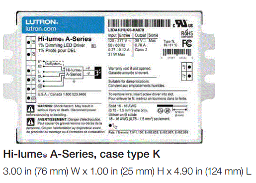 LUTRON 40W CC CONSTANT CURRENT LED DRIVER 120-277V-IN 30-54V-OUT 330mA CCR DIMMING COMPACT CASE, NON-STUDDED 4.2"L 3.0"W 1.0"H