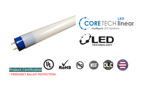 CORETECH WATTAGE SELECT 48"/4' NANO-PLASTIC T8 G13-MEDIUM BIPIN BASE 10W/12W/15W 4000K CRI-82 1600LM/1800LM/2200LM SHATTERPROOF 0-10V DIMMING 325D BEAM ANGLE TYPE C-LED DRIVER REQUIRED 50000HRS NSF2 RATED BAA & TAA COMPLIANT