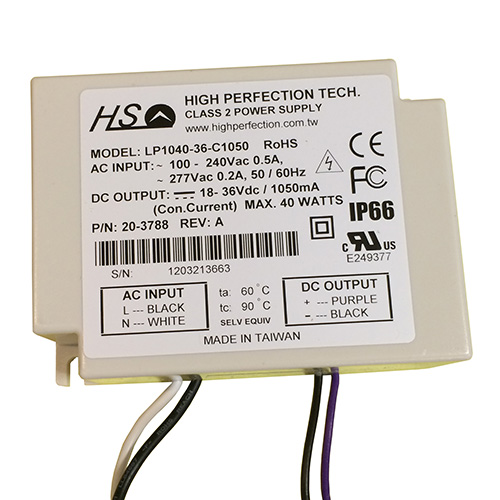 40W LED DRIVER CONSTANT CURRENT CC 90V-264VAC & 277VAC/IN 18V-36VDC/OUT 1050mA RANGE 40W MAX DIMMABLE ELV TRAILING EDGE IP66 100000HRS 3.74"L 2.8"W 1.3"H 0.68 LBS