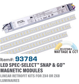 2X4 OR 2X8 SNAP & GO LED LINEAR RETROFIT MAGNETIC MODULE W/DRIVER & 4 LED STRIPS 30W/38W/46W 120V-277V 3500K/4000K/5000K CRI-83 4500LM/5700LM/6900LM 118D BEAM ANGLE B2-U1-G1 BUG RATED 0-10V DIMMING TO 10% 50000HR ENCLOSED RATED IP20 MODULES: L 43.4" D 0.70" DRIVER: L 14.00" W 1.2"