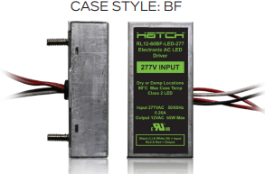 60W LED DRIVER AC TRANSFORMER 277VAC/IN, 12VAC/OUT 5000mA/5.0A 60W MAX 5W MINIMUM LOAD SUITABLE FOR USE WITH AC LED OR HALOGEN LOADS, BOTTOM FEED W/STUDS 5W MIN LOAD 2.72"L X 1.30"W X 0.80"H 0.18LBS EA ***DOES NOT DIM @ 277V***