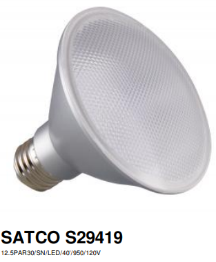 12.5PAR30/LN/LED/25'/930/120V LED 12.5W =75W PAR30LN 120V E26 MEDIUM BASE 3000K 90CRI 1000L 25D FLOOD DIMMABLE 25,000HRS SATCO |