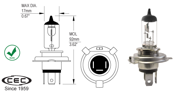 H4-100/55W-I 12V 100W 55W H4 P43T 3.62"MOL 0.67"DIA |