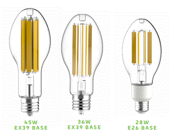 L36WED28-GC-850-U-EX39 36W CLEAR FILAMENT ED28 LED HID REPLACEMENT EX39-EXCLUSIONARY MOGUL SCREW BASE =100W HID 120V-277V TYPE B-BALLAST BYPASS 5000K CRI>80 6000LM WET LOCATION RATED 25000HR L 8.5" D 3.5" |