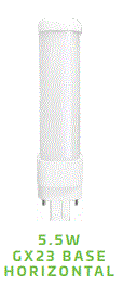 L5.5WPLC/AB/840/U/GX23/HR 5.5W HORIZONTAL PLC LED RETROFIT 2-PIN GX23 ROTATABLE BASE =13W 120V-277V/HYBRID TYPE A & B 4000K CRI-80+ 620LM 120DEG BEAM SPREAD 50000HRS IP20/DAMP LOCATION RATED L 5.47" D 1.30" |