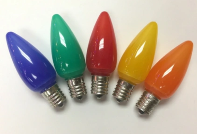 LDC7OPMUD LED C7 BULB E12 CANDELABRA BASE 130V .58W UL OPAQUE MULTI (R/G/B/A/Y) 2 SMD LEDS |