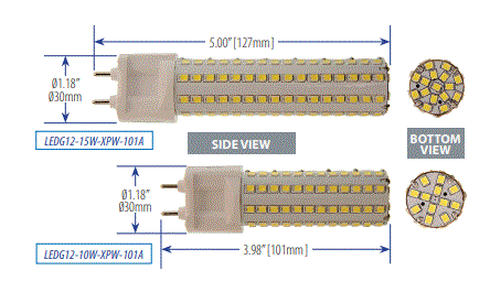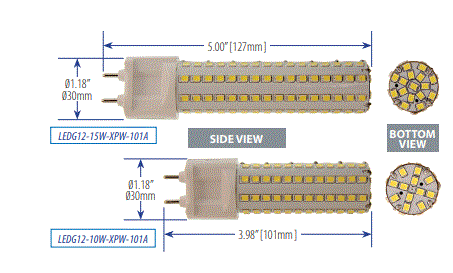 LEDG12-15W-XPW-101A 15W T9 LED G12-CERAMIC BIPIN BASE =CMH35/ CMH39 100V-277VAC TYPE B-BALLAST BYPASS 6000K CRI>83 360D BEAM ANGLE 1960LM NON-DIM 50000HRS L 5.00" D 1.18" 0.17LBS *NON-CANCELLABLE/NON-RETURNABLE/NON-REFUNDABLE* |
