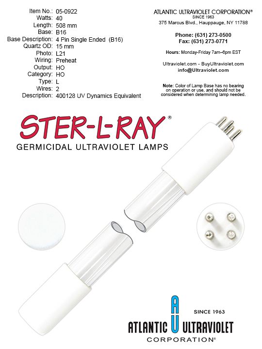 05-0922 40W 4-PIN SINGLE ENDED - B16 20"MOL 0.59"DIA ATLANTIC UV HO PREHEAT WIRE |