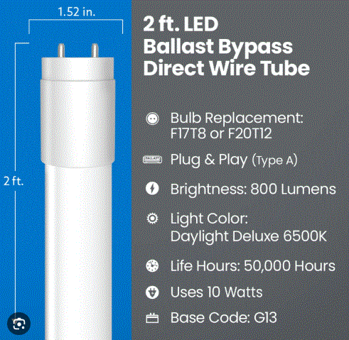 T24/840/LEDG2/RP 10W 24"/2' T8 SHATTER-RESITANT LED G13-MEDIUM BIPIN =F17T8/F20T12 120V-277V TYPE A- MAGNETIC OR ELECTRONIC BALLAST COMPATIBLE 4000K CRI-80 800LM DAMP LOCATION RATED 50000HRS L 23.7" D 1.0" |
