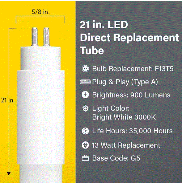 T521/865/LED 12W 21" SHATTERPROOF T5 LED G5-MIN BIPIN BASE 100V-277V TYPE A-BALLAST READY 6500K CRI-80 1100LM 35000HRS L 21.00" D 0.70" |