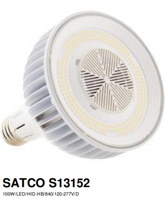 100W/LED/HID/TEMP/5K/120V LED 100W 120V 3 PRONG BASE CORNCOB 5000K 85CRI 10,000L 12"MOL 6.25"DIA IP64 300DEG SATCO |