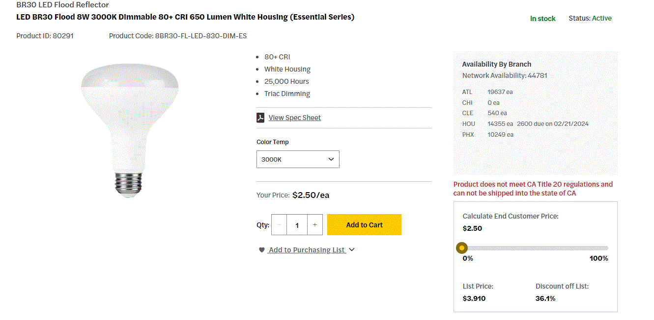 8BR30-FL-LED-830-DIM-ES 8W ESSENTIAL SERIES BR30 LED E26-MEDIUM SCREW BASE = 65W 120V 3000K CRI>80 650LM 110D BEA, ANGLE TRIAC DIMMING 25000HR DAMP LOCATION RATED *NOT/CA-COMPLIANT* 0.49LBS |