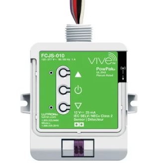 FCJS-010 FIXTURE CONTROL 120/277V UP TO 3 DRIVERS OR BALLASTS 1A 0-10V DIMMING MODULE VIVE 12V 25mA CLASS 2 T20/T24 COMPLIANT L 3.94" W 3.125" |
