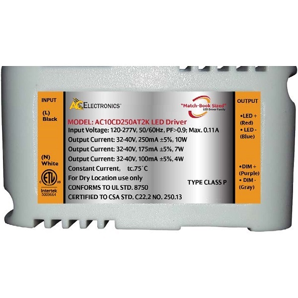 AC10CD250AT2K 4W 100MA 7W 175MA 10W 250MA 120-227VAC-IN 32-40VDC-OUT CC LED DRIVER 0 - 10V 50,000HRS 2.29" X 1.20" X 0.91" ACE BALLAST ** CHECK VENDOR STOCK, MAY HAVE 200PC MOQ |
