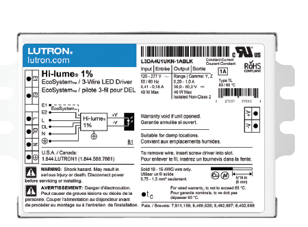 L3DA4U1UKS-IC105 LUTRON 40W CC CONSTANT CURRENT LED DRIVER 120-277V-IN 8-20V-OUT 1050MA DIMMABLE |