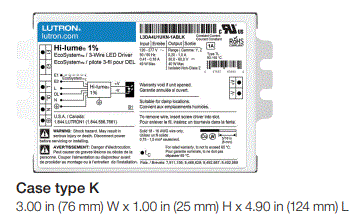 L3DA4U1UKN-KC140 LUTRON 40W CC CONSTANT CURRENT LED DRIVER 120-277V-IN 8-20V-OUT 1400MA DIMMABLE COMPACT CASE, NON-STUDDED 4.2"L 3.0"W 1.0"H |