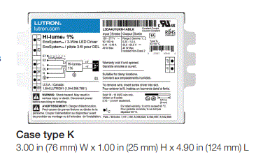 L3DA4U1UKS-EA033 40W CC LUTRON COMPACT STUDDED DRIVER E= 0.20A-0.50A 30V-54V W/CONSTANT CURRENT REDUCTION DIMMING 105=10.5V 4.90"L X 3.00"W X 1.00"H |