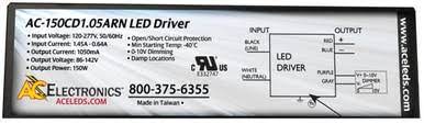 AC-150CD1.05ARN 150W CC CONSTANT CURRENT LED DRIVER 120-277V-IN 86-143V-OUT 1050MA DIMMABLE 0-10V 9.5"L 2.6"W 1.6"H |