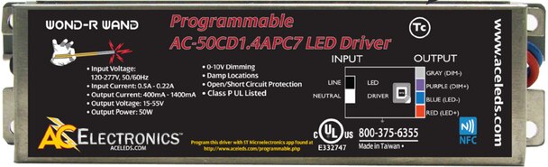 AC-50CD1.4APBTNZ 50W PROGRAMMABLE CC CONSTANT CURRENT LED DRIVER 120-277VAC-IN 15-55VDC-OUT 400-1400MA DIMMABLE 0-10V 1-100% 4.56"L 2.48"W 1.18"H **NEED mA FOR FACTORY PROGRAMMING |