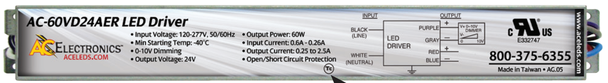 AC-60VD24AER 60W 120-277V-IN 24V-OUT 0-10V DIMMABLE LED DRIVER *VENDOR REQUIRES 200 PIECE MINIMUM PRODUCTION RUN - 14 WEEK LEAD TIME - CANNOT BE CANCELLED* |