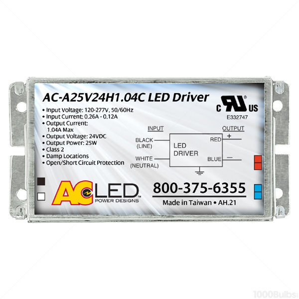 AC-A25V24H1.04C 25W LED DRIVER CONSTANT VOLTAGE CV 120-277VAC-IN 24VDC-OUT OUTDOOR RATED L 4.9" W 2.5" H 1.14" |