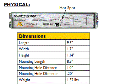 AC-A60VD12H5.0 60W LED DRIVER CONSTANT VOLTAGE CV 120-277VAC-IN 12VDC-OUT 60W MAX DIMMABLE SIDE MOUNT LEADS IP66 L 9.5" W 1.7" H 1.14" |