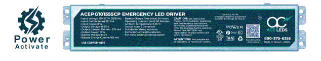 ACEPG101555CP 10W EMERGENCY LED DRIVER W/ POWER ACTIVATE 120-277VAC-IN 15-55V-OUT 180mA-670mA 8W INPUT POWER 90-MIN RUN TIME 3KV SURGE PROTECTION T20 COMPLIANT W/ WIRE LEADS 9.5"L 1.7"W 1.2"H |