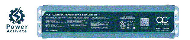 ACEPG10N1555CP 10W EMERGENCY LED DRIVER W/ POWER ACTIVATE 120-277VAC-IN 15-55V-OUT 180mA-670mA POWER ACTIVATE FEATURE ELIMIMANTES EXTERNAL BATTERY CONNECTOR 16.6"L 1.18"W 1.0"H 1.32LBS |