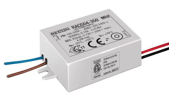 RACD04-500 4W CC-CONSTANT CURRENT LED DRIVER 90V-264VAC/IN 500mA 3V-8VDC/OUT NON-DIM IP65 L 1.50" W 1.06" H 0.83" 0.09LBS |